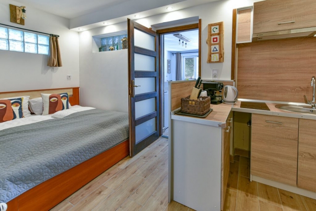 Felszerelt konyha: főzőlap, mikró, vízforraló, kávéfőző, hűtő, edénykészlet.
